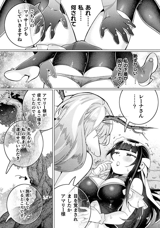 無知なお嬢様がえっちなマッサージに言葉巧みに騙されレズ快楽に目覚める! お嬢様であるアマリーは1人前のレディーとなるべく館を抜け出し街へ向かうがその道中、辺りを漂ういい香りに誘われてしまい道から外れ、森の中へ引き寄せられてしまう。そして、彼女はマッサージ屋を名乗るドライアドのレーナと出会うが、アマリーはレーナから発する花の香りに過度にあてられ、意識が途絶えてしまう。そして、目を覚ました時には彼女の店に運ばれマッサージを受けている最中で、突然の出来事に理解できない彼女だったが、言葉巧みに誘うレーナに身を委ねることに。秘部を触られるという初めての経験であっという間に絶頂してしまったアマリーは、続け様にレーナの身体から分泌される粘液を全身に塗り込み全身を使った施術で虜になっていく……。