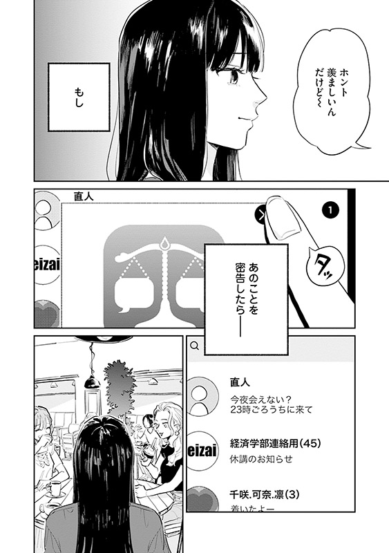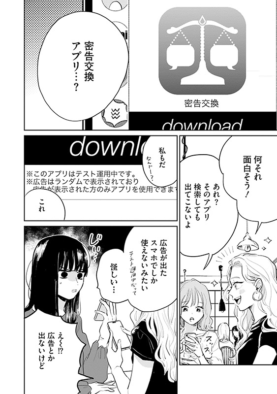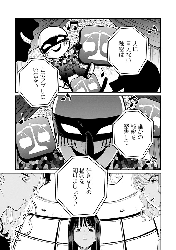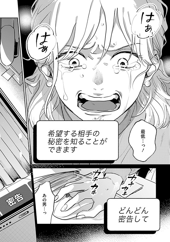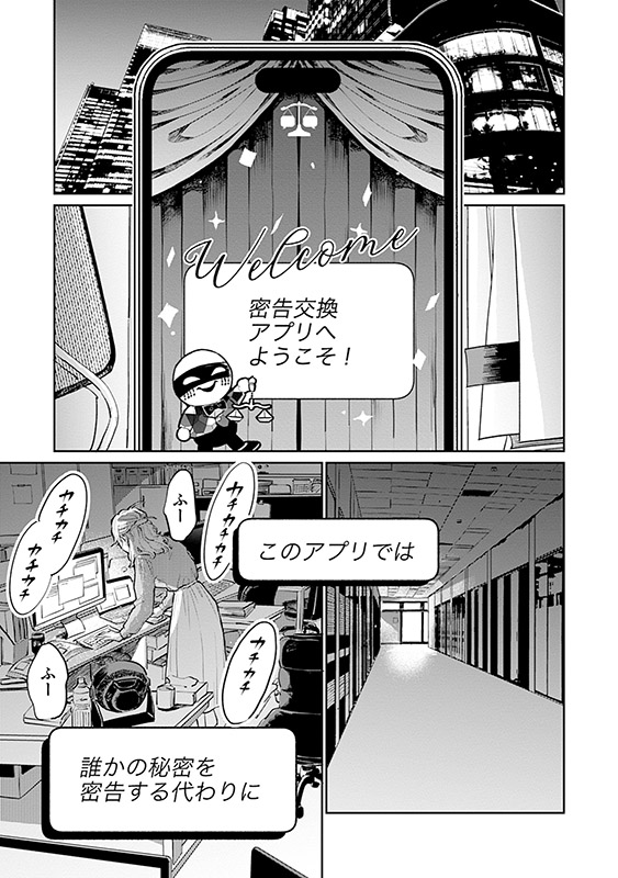 誰かの秘密を入力すると、代わりに希望する人の秘密を教えてもらえる『密告交換アプリ』。帝都大学に通う凜は、学内で起きた婦女暴行事件の真相を偶然知ってしまい、持ち前の正義感からアプリに密告する。 しかし、その代わりに知りたくなかった情報を知らされてしまい――。アプリに翻弄される人間たちのドロドロを描くSNSホラー、開幕。 ※1〜3話を収録