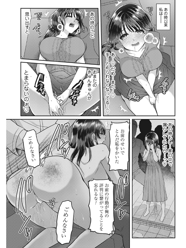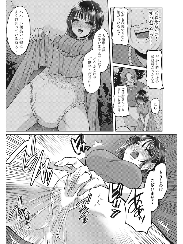 幸い、親族は車で去った後。夫も家に戻っており、誰にも見られることはなかったが、その日から那央はおもらしの快感に取り憑かれてしまう。誰もいない日中は、庭で、キッチンで、ベランダで……夜はお風呂で夫の背中を流しながら、おしっこを出すこともあった。家の至る所でマーキングのように排尿しては、ここは私の縄張りとほくそ笑む。その一方で、「こんな下品な嫁でごめんなさい」と、行為が発覚して責められる自分を妄想しながらオナニーに励む日々。