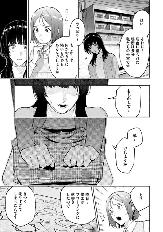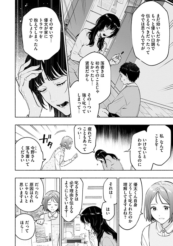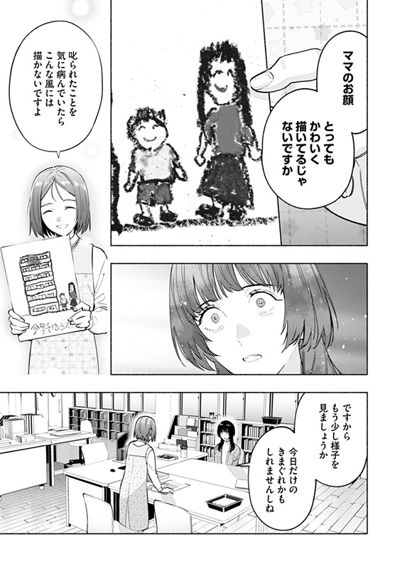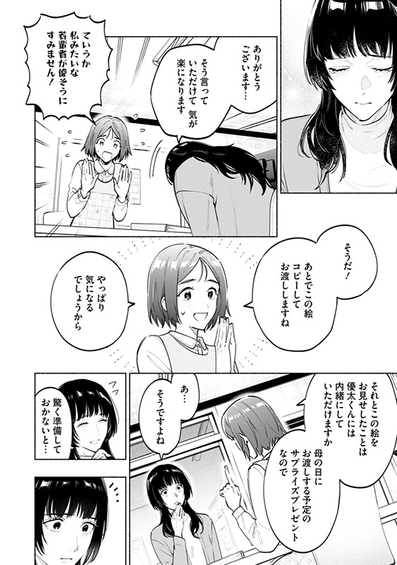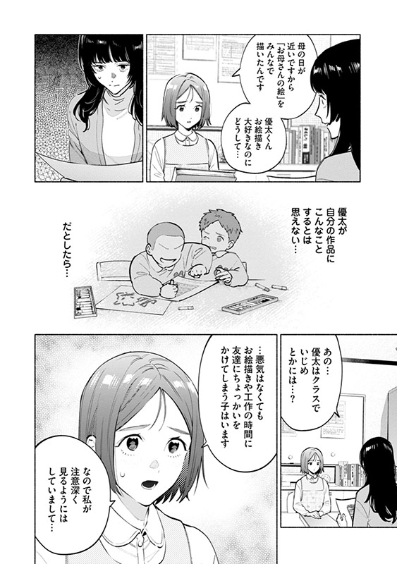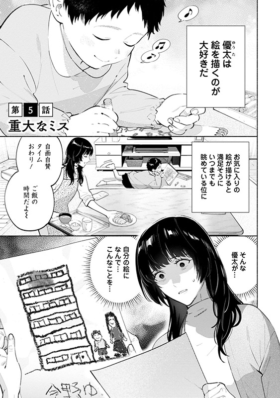 今野優太が保育園で描いた母の日のプレゼント用の絵。そこには、微笑む直美と優太、そして二人の住むマンションが描かれていた。しかし、なぜか二人の住む部屋が灰色で塗りつぶされており──。そして保育園からの帰り道、またしても直美たちは怪しい車に追いかけられて──。