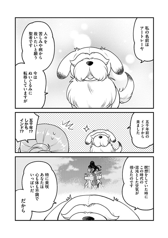 心身共にストレスを抱えながら毎日を過ごす朝倉美咲の前に現れたのは、古代から現代にやってきたアーユルヴェーダの指導者・アートレーヤだった……犬のぬいぐるみの姿で!!