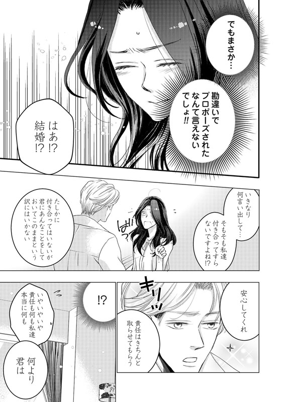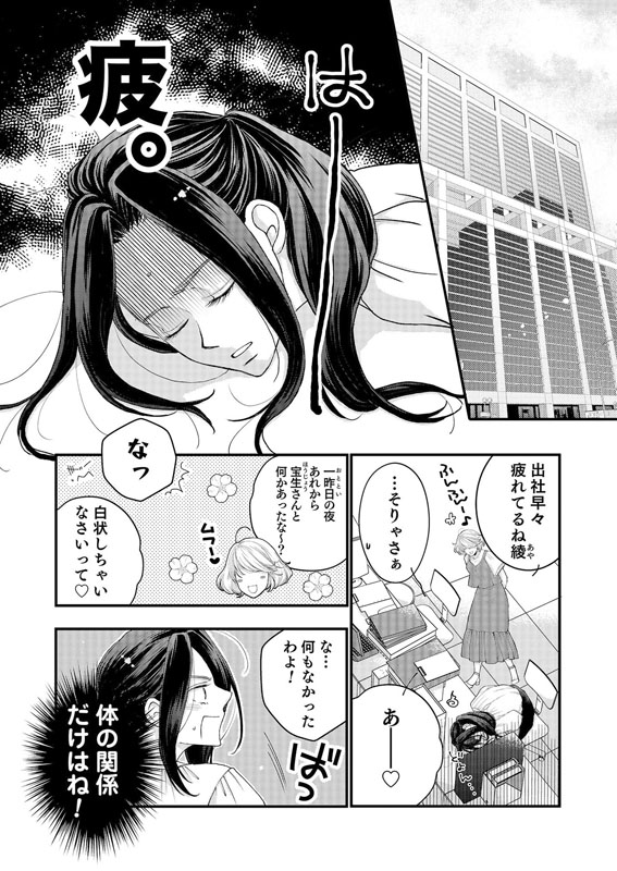 何故に、一夜を共にしたからと言って(誤解だけど)プロポーズ!?…と思ったら、その答えがわかった。宝生さん、まさかのDT!!結婚まで取っとく派だったとは〜〜〜(爆)!!! 給料3ヶ月分の謎は解けたものの、私が宝生さんの童貞を頂いたという誤解は解けぬまま、翌日の会社で…。
