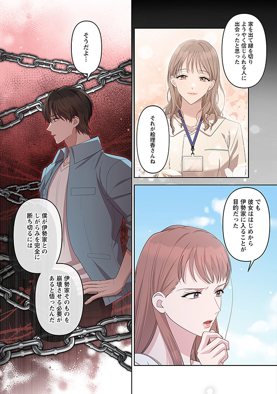 結婚から数ヶ月経ったある日、あろうことか絵理香は、由貴也の兄・雅之との○○を身籠ったと宣言する。「私、この伊勢家で、すべてを私のものにしてみせる。ここまで連れてきてくれてありがとう」なんと絵理香は、伊勢家に取り入るために由貴也を利用した悪女だったのだ。