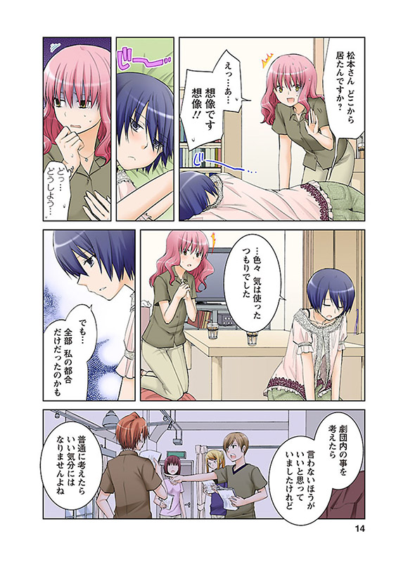 真面目で律儀な女子大生・榊さんと、良い子で礼儀正しい中学生・立花君のハラハラでドキドキでニヤニヤな恋愛模様や、「ひとひら」メンバーとのお馴染みの掛け合いや、ネガティブOL・松本さんの可愛いボケっぷりや、榊さんを日々悩ませるシリアスな劇団内の人間関係までも、すべて作者・桐原いづみ完全監修によるフルカラーでお見せします!!