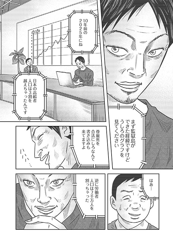 経済の悪化と犯罪件数の増加で、国民の疲弊と憎悪が蔓延する日本、そこで提案されたのが監獄島だった。それは広大な孤島で受刑者が税金に依らず自活するという、自治と自由を謳った刑務所だった。しかしそこに配属された新人刑務官、富沢の見たものとは──!【ズズズキュン!】