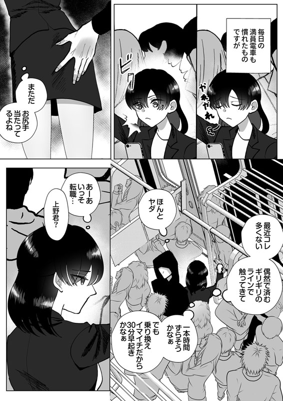 通勤電車でのしつこいイタズラに悩まされている OLのしおり。上司や部下と電車で乗り合わせた時にも、触られる始末で困っていたが……