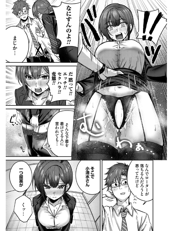 「ストレス発散!?」小清水の事情を聞き出すも彼女は、立花は社内で絶対言いふらすから社長に頼んで左遷すると脅してくる。こんな貧乏くじまで引いてたまるか!話を聞かない小清水を黙らせるため、立花はスカートスーツをたくし上げる。その下はやっぱりノーパンガーターベルトで…。それでもなお罵倒する小清水に交換条件を突きつける。『バイブをつけたままイカずに一日中過ごせれば、大人しく左遷されます』ずっと甘い刺激が襲い仕事にまったく集中できない小清水。もう我慢の限界、倉庫で一人隠れてオナニーしようとするが…?
