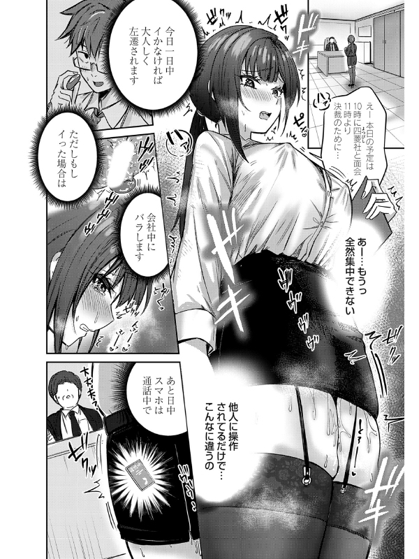 立花(たちばな)は貧乏くじをよく引くせいか、会社で出世が一番遅い。一方同期の小清水(こしみず)は枕営業の噂が絶えない美貌と身体。出世頭で社長秘書。ある日、エレベーターで二人っきりになると立花は謎のリモコンを拾う。動かしてみると、目の前にいた小清水が突然甘い声で喘ぎ出して!?彼女は立花の心配を振り払い下りようとするが、出力最大でまた嬌声をあげる。さらに突起満載のバイブまで膣内から落ちてしまい…。