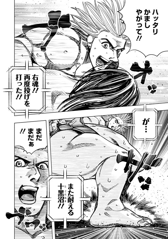 十黒沼(とぐろぬま)に必殺の右を封じられた右魂(うこん)。しかしライバル・生命力(いのちりき)も知らない新たな必殺技を披露する!