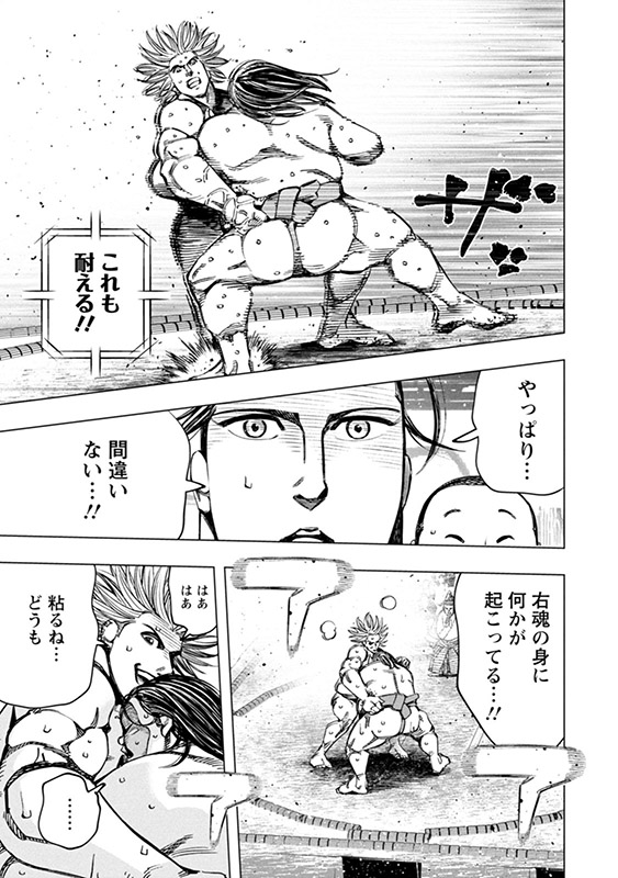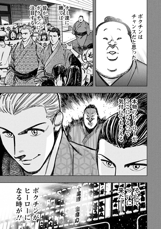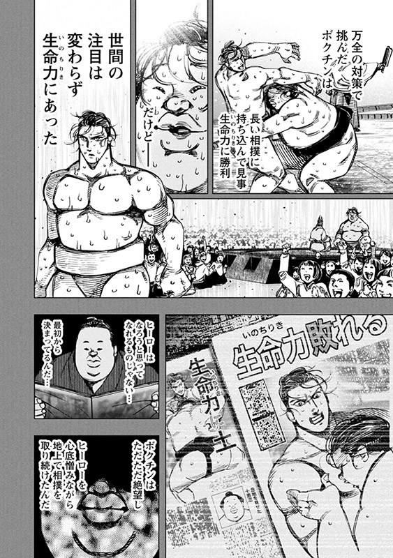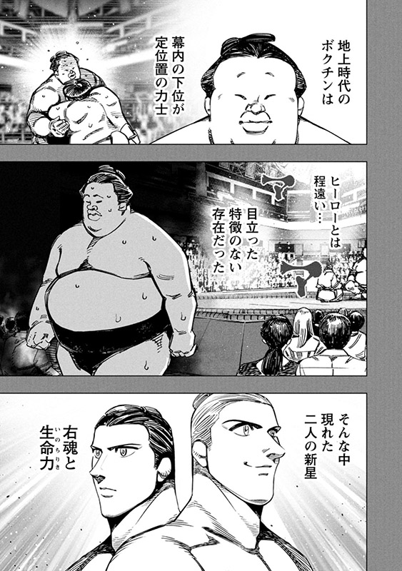 続く第三試合は最軽量98kgの小兵(しょうへい)と最重量285kgの大霜降(おおしもふり)が激突! そして試合会場が盛り上がる中、現在地上最強の力士・馼牛劉(もんごりゅう)が地下へ。参戦力士たちが集う控え室に現れて…。