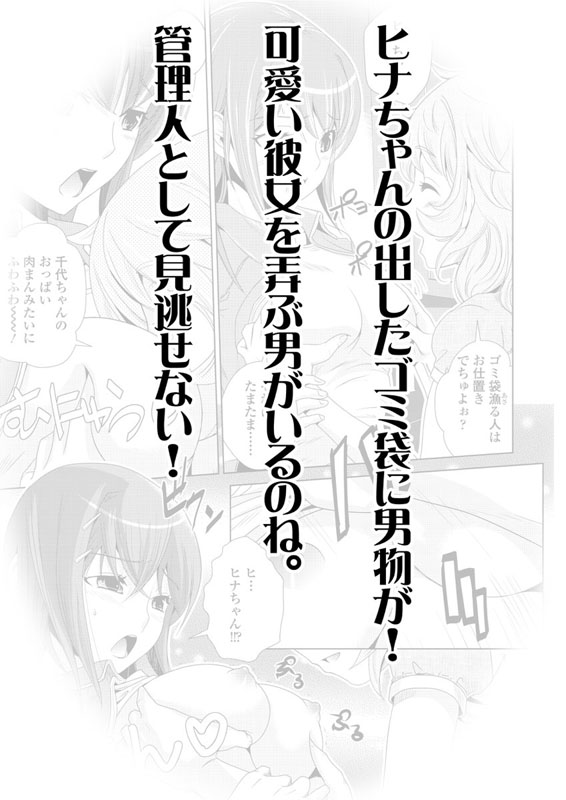 可愛いヒナちゃんの部屋から出たゴミ袋には、なんと男物がドッサリ! ははーん。きっと彼女は悪い男に体を弄ばれてるんだわ。 これは管理人として、女性として、見逃せない!敏感管理人の管理人さん、乙女のピンチに立ち上がります…はずなのですが?