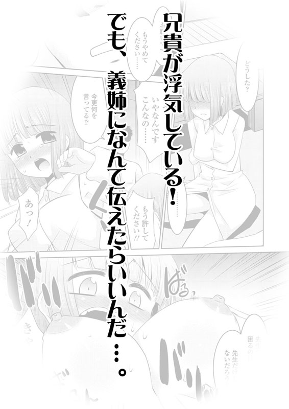 兄貴が浮気していた。好き勝手に女教師の肉体を貪ってやがる。綾姉ぇという奥さんがいるってのに。そうだ、早く綾姉ぇに伝えなきゃ…って、伝えてどうなるんだ。冷たく接してくる家族の中を必死に生きている彼女に、俺はいったい、何ができるっていうんだよ。田舎に戻った失意の青年・良二。己の無力さを嘆き、そして…。