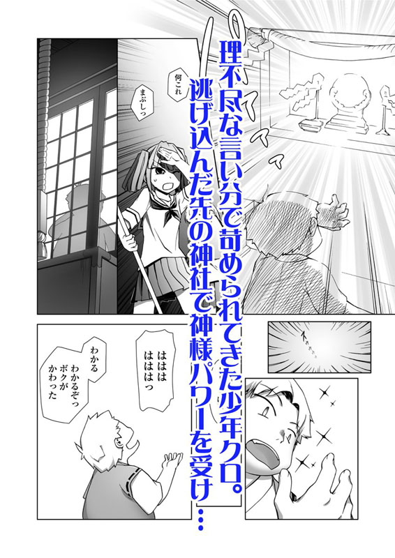 僕は突然、神さまになっちゃった。いじめられっ子だった暗い過去も、みんなの記憶もから消えたみたい。可愛い巫女さんが三人もついて…ああ、これで人生バラ色?え、下着が盗まれた? じゃあ今は下に何も付けてないってこと?ぬ…脱いでほしいなぁ…って、そんな願い事はアリ?