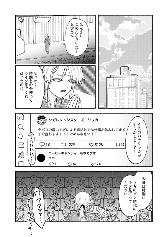 立花(たちばな)リッカは社畜生活に限界を感じ、○い頃からの夢だった芸人の世界へと飛び込んだ。仕事に恋愛…すべてを地固めしていかなければならないことは分かっている。それでもアルバイトで食い繋ぎながらもジリ貧ピン芸人生活を送るリッカの目の前に、憧れの先輩芸人である猪熊(いのくま)ミドリが現れて…!?むせ返るほどにあがいて、もがいて、駆け上がる芸人群像劇の幕が上がる──。【ズズズキュン!】