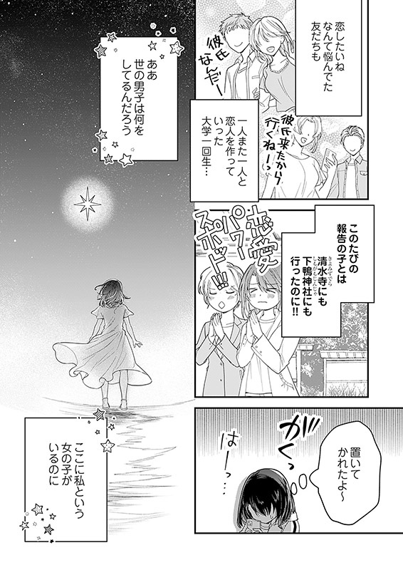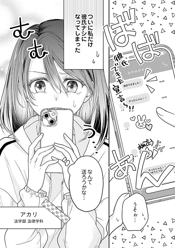 大学生のアカリのスマホを震わせるのは、友達からの幸せ報告。おめでとうって喜びたいけど、どうしてもモヤモヤする。「友達はみんな彼氏ができていくのに、どうして私にはなんにもないの!?」待っていればいつか運命の人が現れるはず。だって私はメイクや服装に気を遣ってるし、勉強も頑張ってるし、パワースポットにも行っているし! でも、やっと誘われたデートはサイアクの思い出になってしまった。このまま私、ずっと独りぼっちかもしれない。自暴自棄になるアカリの目の前に現れた謎の心理学講師・ベニコ。ベニコの恋愛レッスンでアカリの人生は大きく変わり始めて…!?
