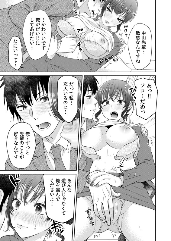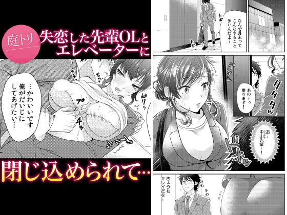 帰りのエレベーターが突然止まってしまい密室に2人きりになる藤井と中山。藤井は美人でスタイルのいい先輩の中山に秘かに想いを頂いていた。彼氏に騙され悲しんでいる中山の姿を見て、自分の気持ちを抑えきれない藤井は遂に彼女を押し倒してしまう。