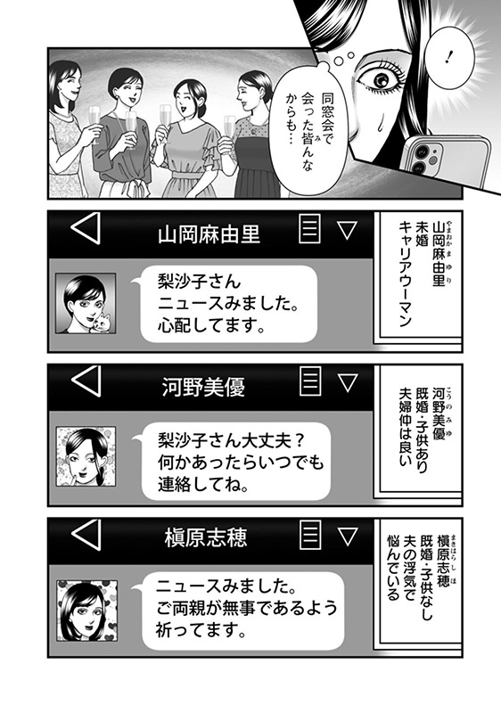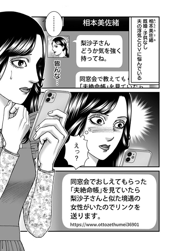 そして1年後──大学の同窓会で「夫絶命帳」というサイトが話題になっていることを知る梨沙子。それは夫に苦しめられたあげく結婚生活に絶望した妻たちの悩みや愚痴、さらには夫が弱って死ぬ方法までが投稿される過激なサイトだった!!