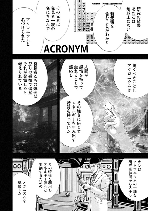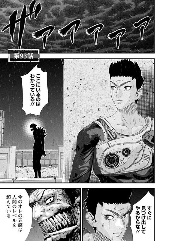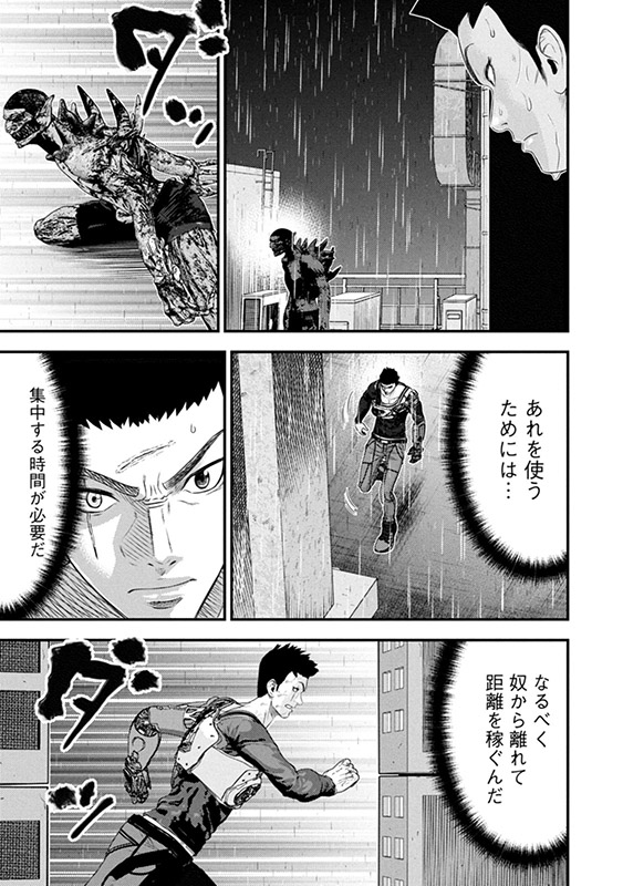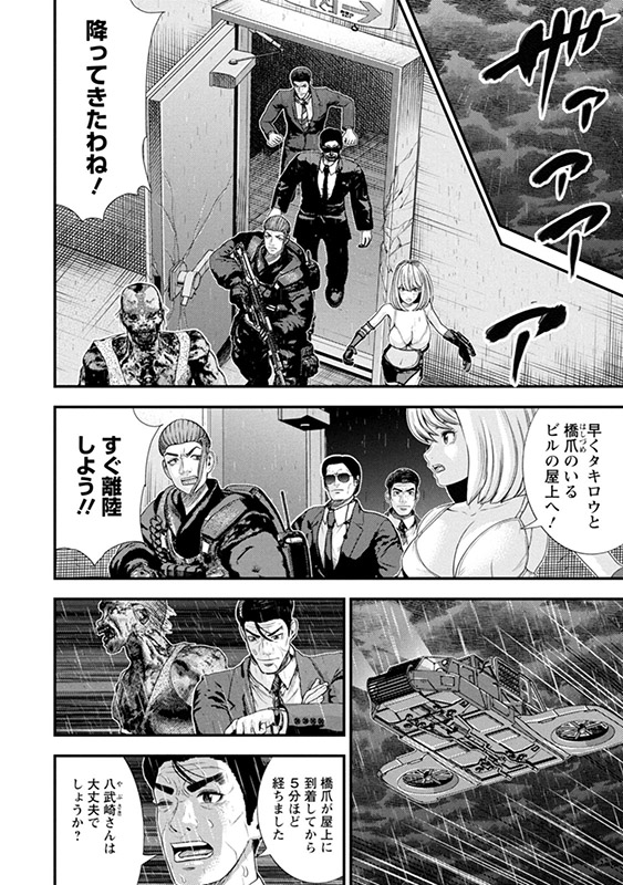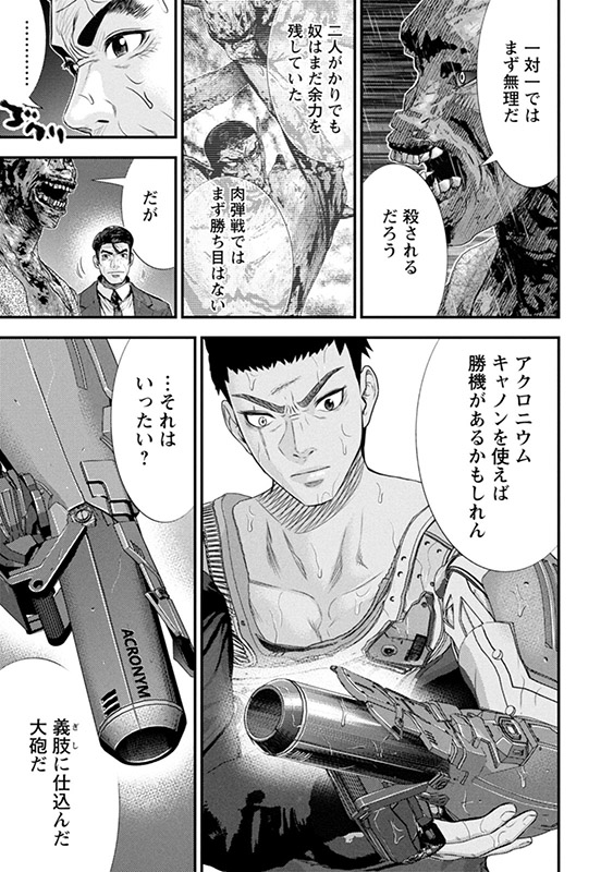 高層ビルでの戦闘中、瀧郎は橋爪に巻き込まれる形でビルから落下したが、間一髪のところで隣のビルに飛び移ることができた。だが、地面に激突したはずの橋爪はほぼ無傷。すぐさま瀧郎を追ってビルを駆け上ってきた。 化け物相手に一対一の勝負を強いられることになった瀧郎は、義肢に仕込んだ奥の手の大砲を使うことを決めた!