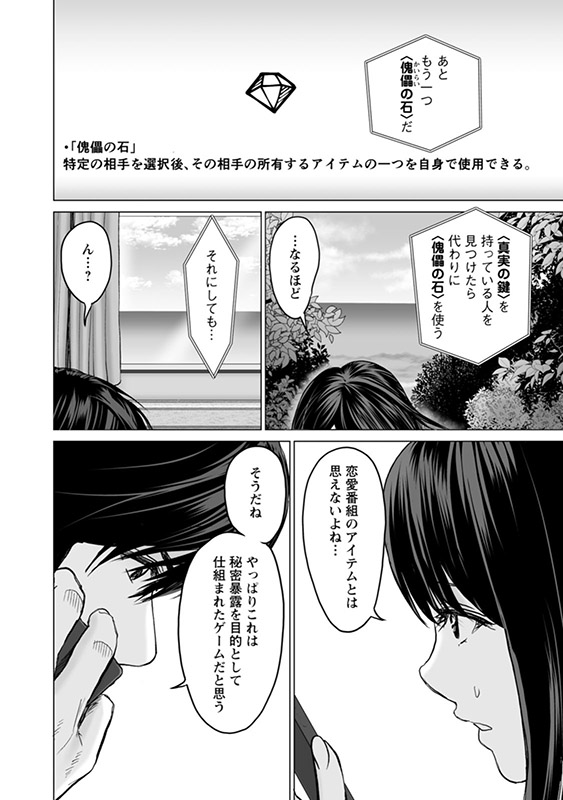 島内に隠された様々なアイテムを探し、それを駆使してカップル成立を目指す最後のステージがスタートした。芽衣も、離脱した翔太から携帯で指示を受けながら奔走する。 そんな最中、参加者が殺害される事件が起きてしまい…常軌を逸したショーの行方は!? そして過去の翔太の父の死の謎は解き明かされるのか!? ※21〜24話を収録